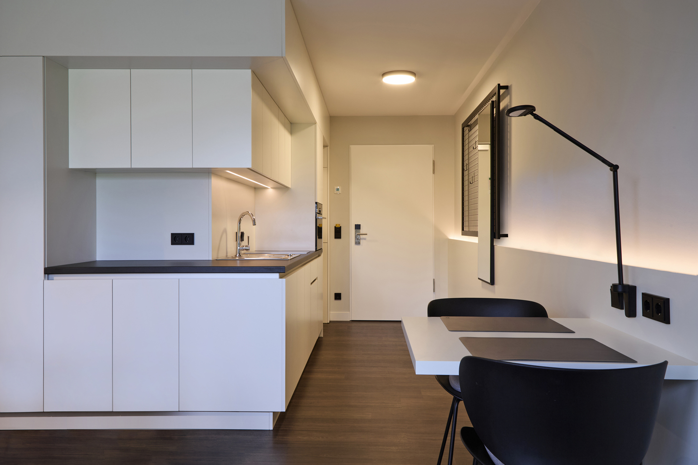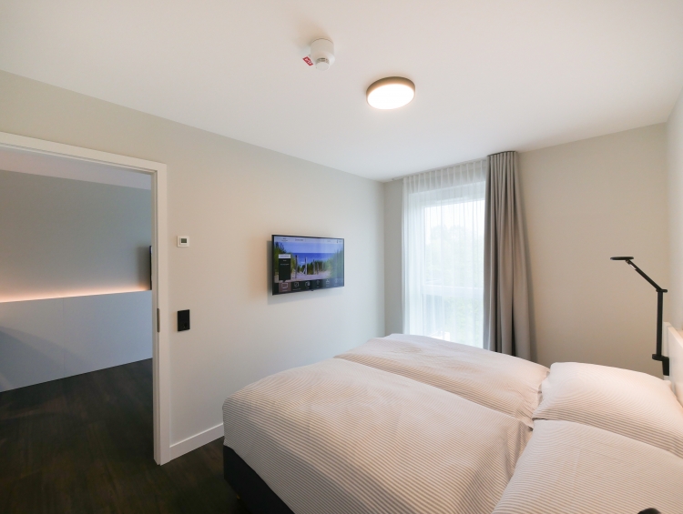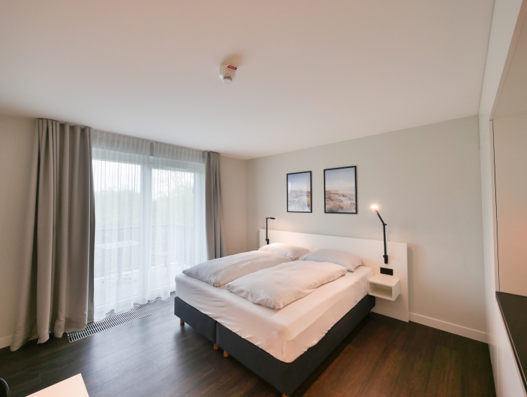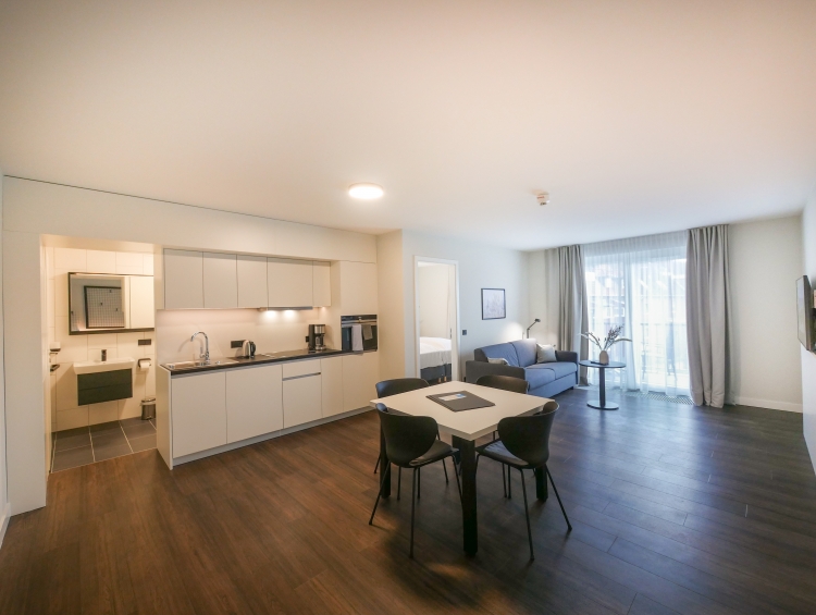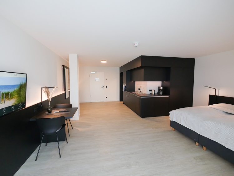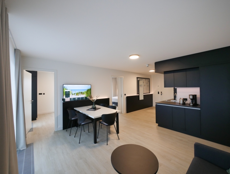 Diese Hotelappartements bieten ein kombiniertes Wohn-/Schlafzimmer mit einem komfortablen Doppel-Boxspringbett. Die Einbauküche ist voll ausgestattet, inklusive Backofen, Geschirrspüler und Kühlschrank mit Tiefkühlfach. Internet-TV und WLAN sind ebenfalls vorhanden. Das Badezimmer verfügt über eine Walk-In Dusche und ein WC, ideal für Einzelpersonen oder Paare, die eine kompaktes, aber gut ausgestattetes Hotelappartement suchen.